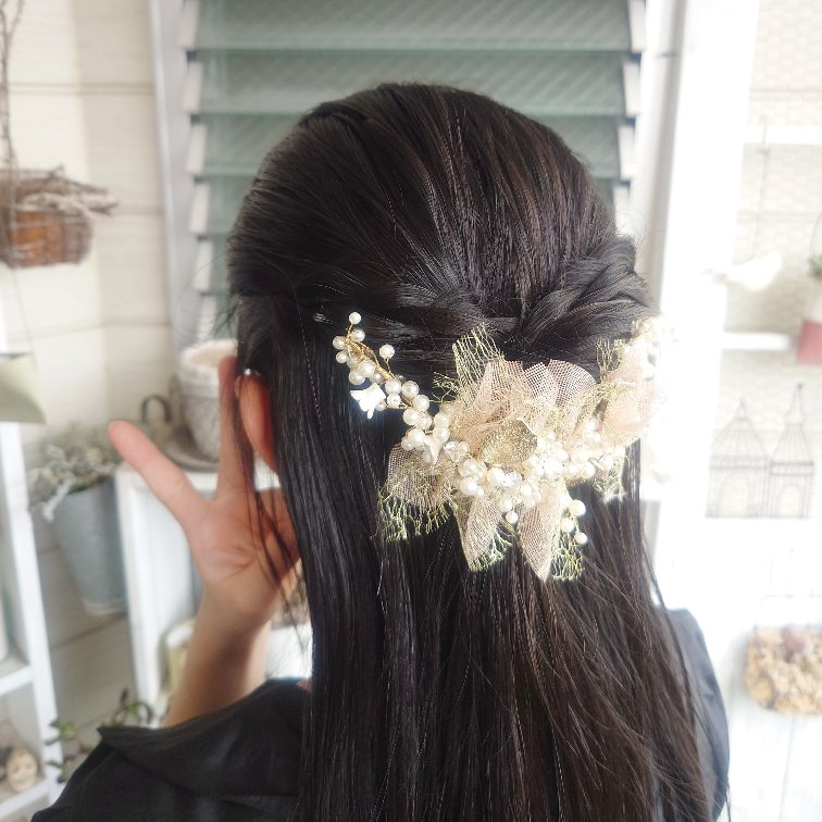 今年は、服がボリューム少ないシンプルなものだったということもあり、上方はアップにせずにハーフアップに。みつあみとくるりんぱを足してほぐしてボリュームをだしました。そして毎年使っているパールとチュールリボンの華やかなヘアアクセをつけて完成!